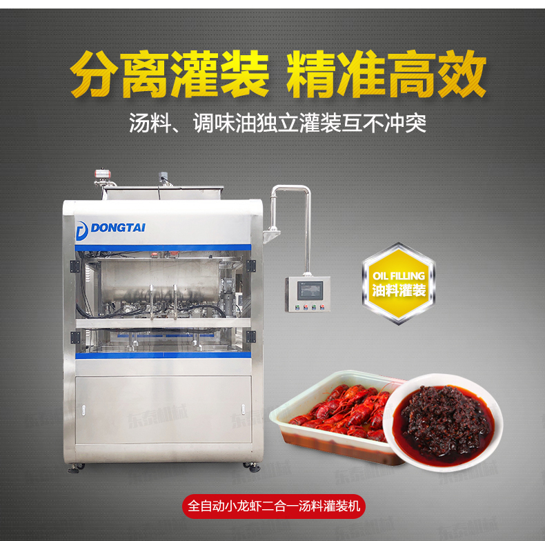 紅油辣椒醬自動灌裝機針對于調味小龍蝦深加工行業的調味油、湯料的加注,整個系統為直線式傳送結構,湯料、調味油可在同一臺設備上實現準確定量,且湯料、調味油為獨立的灌裝系統,互不沖突,具有灌裝范圍廣、速度快、維護簡單等特點,該系統可大大減少生產環節中的浪費,同時也提高了生產效率,為企業節約生產成本。