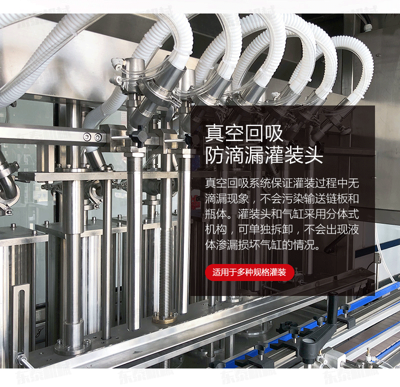 1.真空回吸系統(tǒng)保證灌裝過程中無滴漏現(xiàn)象,不會污染輸送鏈板和瓶體。灌裝頭和氣缸采用分體式機構(gòu),可單獨拆卸,不會出現(xiàn)液體滲漏損壞氣缸的情況。進口亞德客氣缸經(jīng)久耐用,其他密封等配件使用標準件,更換維護簡單方便。