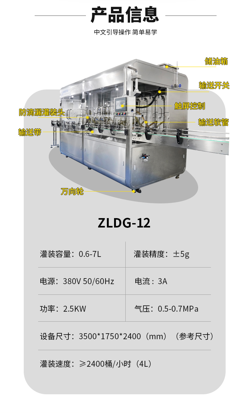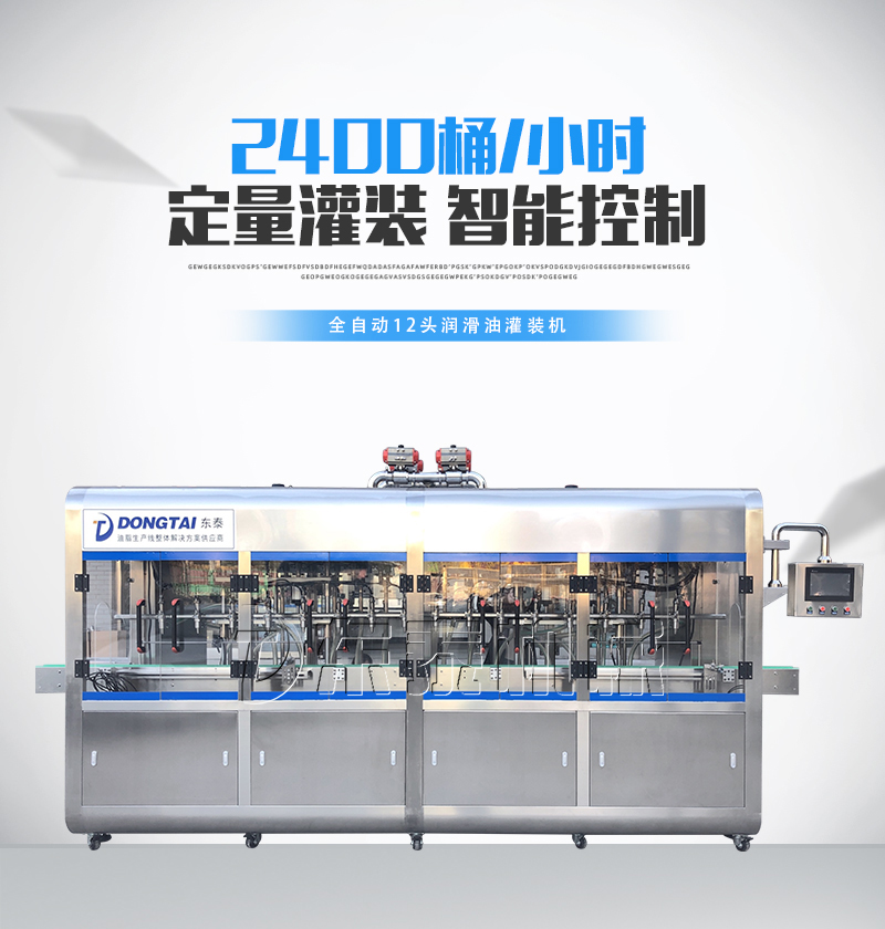 該灌裝機可以配置 高速旋蓋機 油桶貼標機 油瓶噴碼機 油壺自動自動裝箱碼垛機。組成油脂灌裝包裝流水線。節能、自動化的設備。