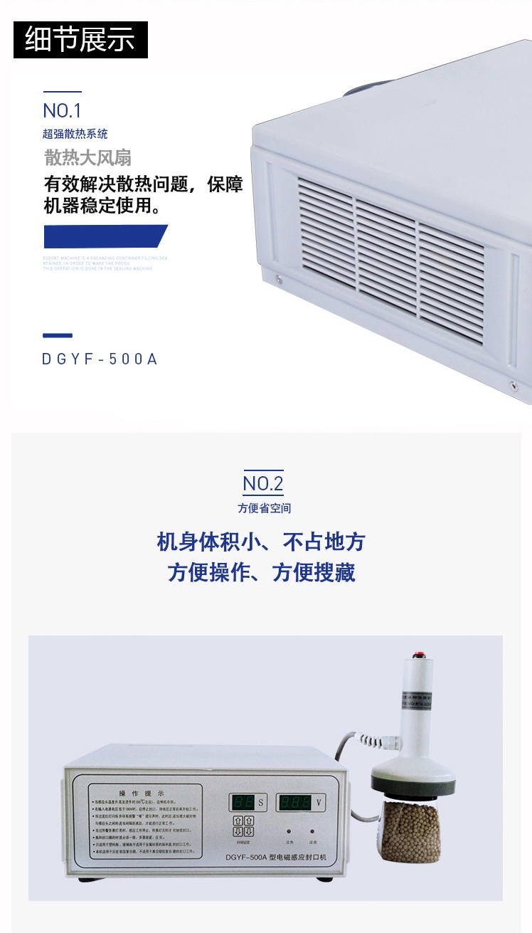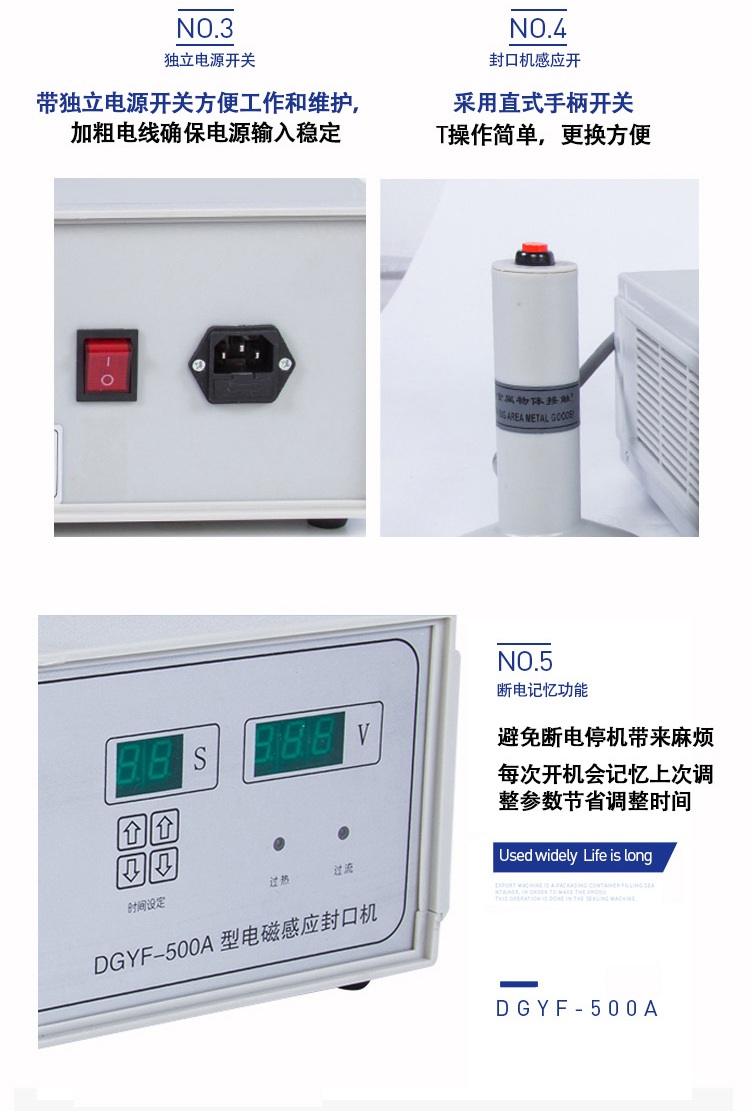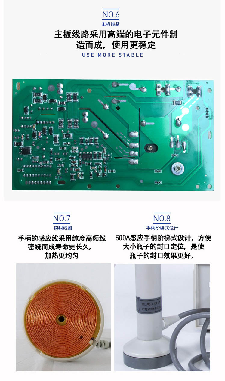 該封口機是一種便攜式電磁感應加熱封口設備,專為制藥、化工、農藥、食品、化妝品、輕工行業對容器進行鋁箔嚴密封口。封口材質使用廣泛,可以是聚乙烯、聚丙烯、聚苯乙烯、聚酯以及玻璃瓶,但不能用于金屬瓶體及瓶蓋。本機小巧輕便,使用簡單,適用于小批量生產和實驗室作業。本機采用國外先進線路,選用日本最新模塊化功率器件,較于一般電子感應加熱器更省電,熱效率達到90%以上,瞬時加熱速度為后者的20-30倍,因此不僅適用于熱封性能較好的聚乙烯、聚丙烯材質的瓶體,而且對熱封性能較差的聚酯瓶、玻璃瓶也有極好的封口效果。